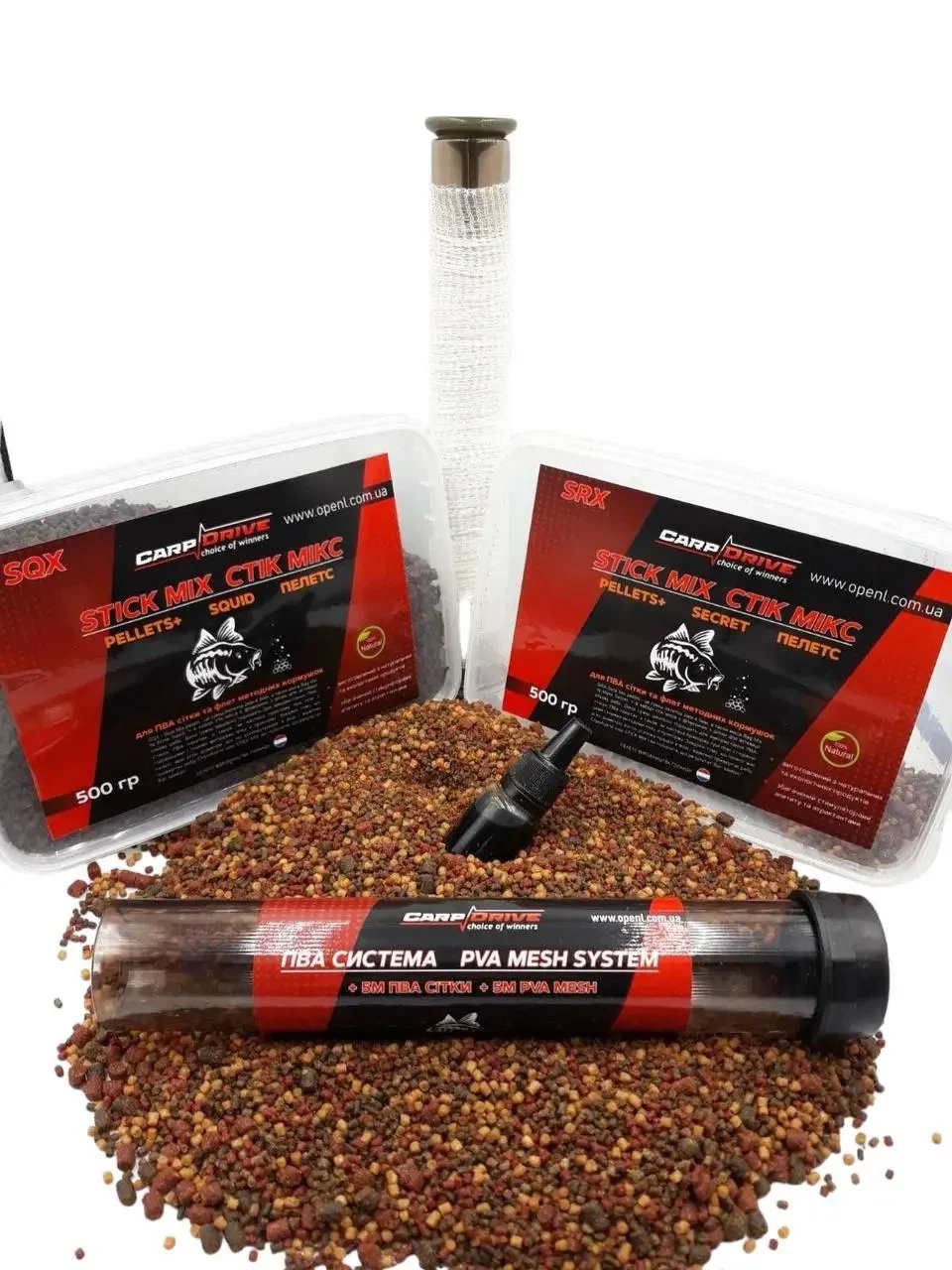 Stick mix pellets - це суміш пеллетса 2мм-4.5 мм, а також міксу Bag Mix і борошна + набори стік міксу мають флакон з діпом для активації клювання риби. Дана суміш ідеально підходить для ПВА сітки, ПВА пакетів, а також як частина прикорму при лові з годівницями або іншими методами лову і прикорму.